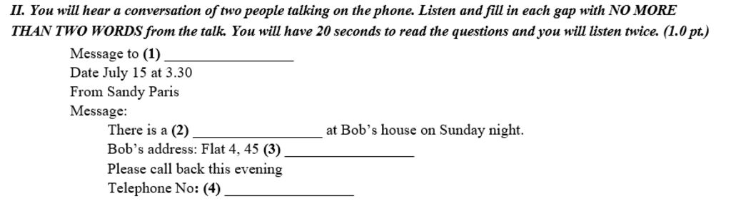 II. You will hear a conversation of two people talking on the phone. Listen and fill in each gap with NO MORE THAN TWO WORDS from the talk. You will have 20 seconds to read the questions and you will listen twice. (1.0 pt.)