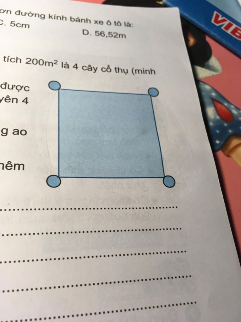 a) Anh Năm mở rộng ao làm sao cho các đường chéo của cái ao hình vuông bằng đường kính của ao khi mở rộng hay 4 cái cây khi đó vẫn nằm ở 4 góc ao (trong ảnh)
