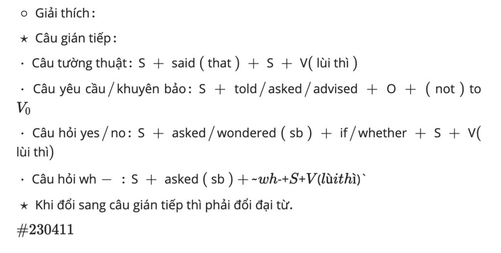 `+)` Wh `-` question : S + asked + wh + S + V ( lùi thì ) + O.