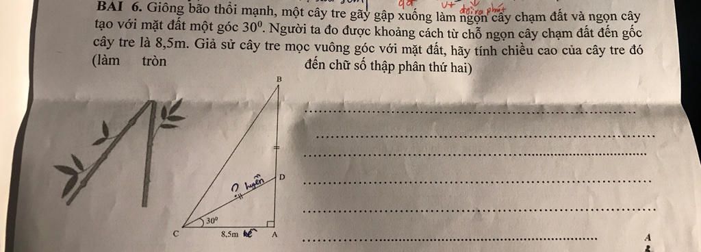 cây tre là 8,5m. Giả sử cây tre mọc vuông góc với mặt đất, hãy tính chiều cao của cây tre đó