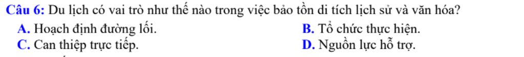 `->` Ngành du lịch tạo ra nguồn thu từ hoạt động tham quan, giúp duy trì và phục hồi các di tích, đồng thời nâng cao nhận thức của cộng đồng về giá trị văn hóa lịch sử, từ đó khuyến khích việc bảo tồn và phát huy di sản.