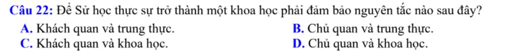 `->` Sử học cần phải được nghiên cứu và trình bày dựa trên sự thật lịch sử một cách khách quan, không bị ảnh hưởng bởi quan điểm cá nhân hay tư tưởng chủ quan. Điều này giúp đảm bảo tính chính xác và tin cậy của các nghiên cứu lịch sử.