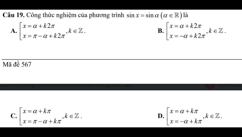 `-> x=alpha+k2pi` hoặc `x=pi-alpha+k2pi(k in ZZ)`