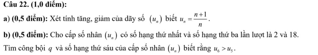 a) (0,5 điểm): Xét tính tăng, giảm của dãy số (`u_n`) biết `u_n` =`(n+1)/n`