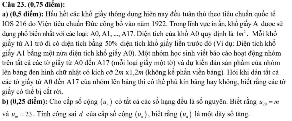 a) (0,5 điểm): Hầu hết các khổ giấy thông dụng hiện nay đều tuân thủ theo tiêu chuẩn quốc tế IOS 216 do Viện tiêu chuẩn Đức công bố vào năm 1922. Trong lĩnh vực in ấn, khổ giấy A được sử dụng phổ biến nhất với các loại: A0, A1, ..., A17. Diện tích của khổ A0 quy định là 1`m^2`. Mỗi khổ giấy từ A1 trở đi có diện tích bằng 50% diện tích khổ giấy liền trước đó