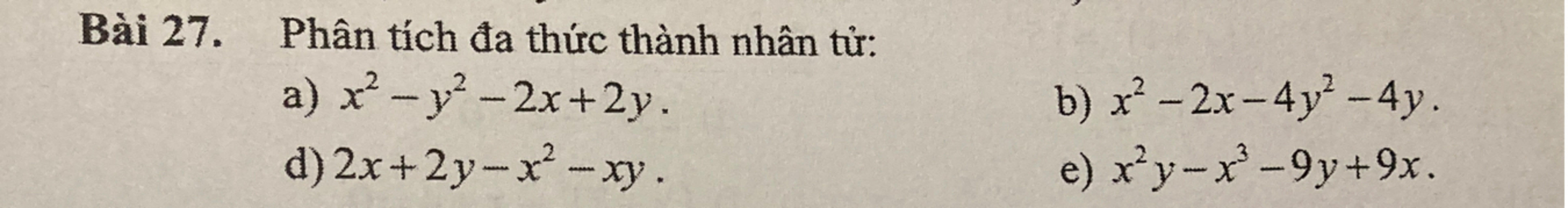 e.$x^2y-x^3-9y+9x=x^2(y-x)-9(y-x)=(x^2-9)(y-x)=(x-3)(x+3)(y-x)$