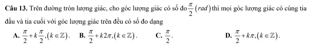 Câu 13. Trên đường tròn lượng giác, cho góc lượng giác có số đo `π/2` (rad) thì mọi góc lượng giác có cùng tia đầu và tia cuối với góc lượng giác trên đều có số đo dạng