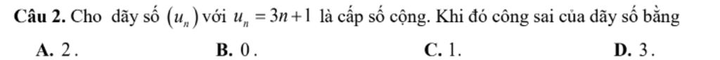 Câu 2. Cho dãy số (`u_n`) với `u_n= 3n+1` là cấp số cộng. Khi đó công sai của dãy số bằng