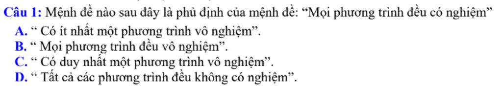 Phủ định của mệnh đề “Mọi phương trình đều có nghiệm” là mệnh đề “Có ít nhất một phương trình vô nghiệm”