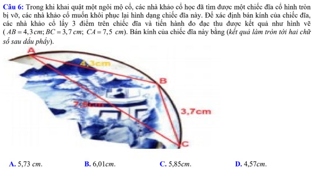 Câu 6: Trong khi khai quật một ngôi mộ cổ, các nhà khảo cổ học đã tìm được một chiếc đĩa cổ hình tròn bị vỡ, các nhà khảo cổ muốn khôi phục lại hình dạng chiếc đĩa này. Để xác định bán kính của chiếc đĩa, các nhà khảo cổ lấy 3 điểm trên chiếc đĩa và tiến hành đo đạc thu được kết quả như hình vẽ (AB=4,3 cm; BC =3,7 cm; CA=7,5 cm). Bán kính của chiếc đĩa này bằng (kết quả làm tròn tới hai chữ số sau dấu phẩy).