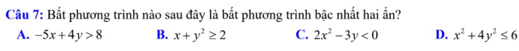 Chọn `A` vì Bất phương trình có `2` ẩn và số mũ `2` ẩn là `1`
