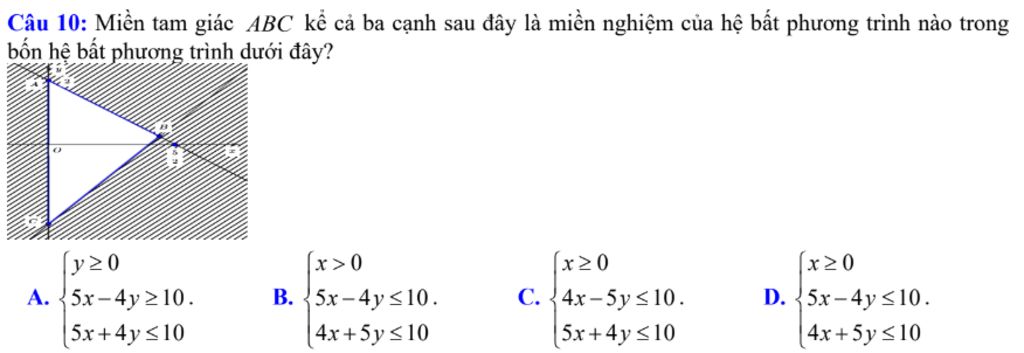 Câu 10: Miền tam giác ABC kể cả ba cạnh sau đây là miền nghiệm của hệ bất phương trình nào trong bốn hệ bất phương trình dưới đây?