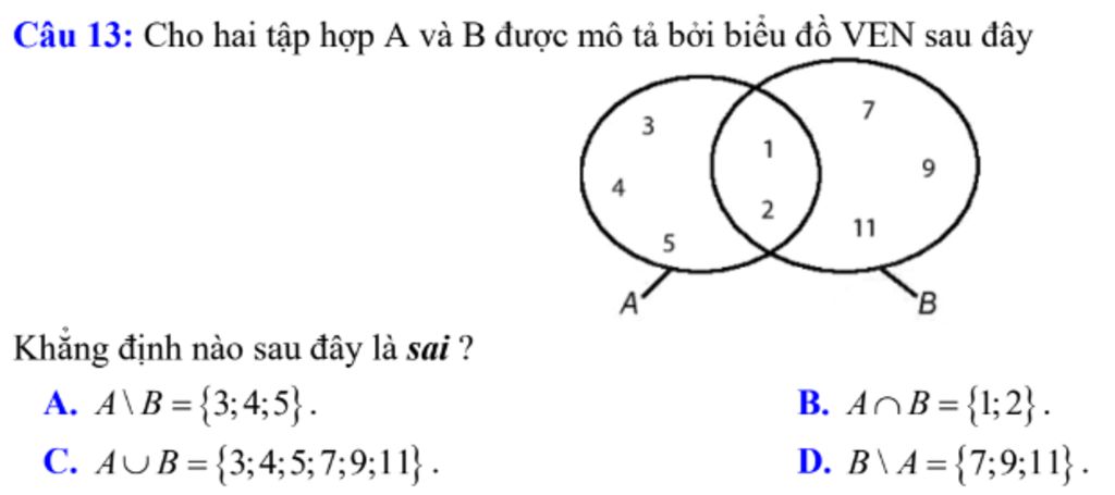 `A\\B = {3;4;5}` ( Lấy những phần tử thuộc tập `A` mà không thuộc tập `B)`