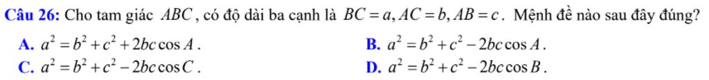 `a^2 = b^2+c^2-2bc.CosA` ( Định nghĩa )