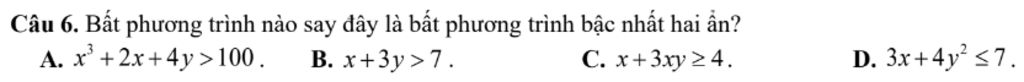 Câu `6:` Ta có định nghĩa: bất phương trình bậc nhất hai ẩn có dạng: `ax+by<c;ax+by>c;ax+by\ge c;ax+by\le c` (với `a,b\inRR`)