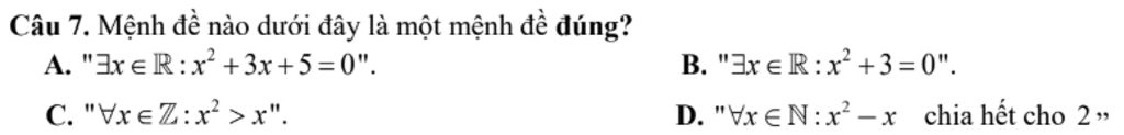 `D.` Đúng vì `x^2-x = x(x-1)` là tích `2` số tự nhiên liên tiếp `=>x^2-x\vdots 2`