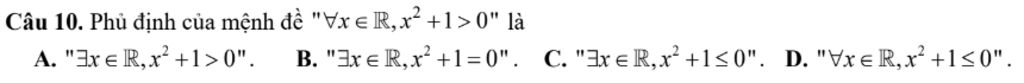 Mệnh đề phủ định : " `\exists x∈R, x^2 +1 <= 0`"