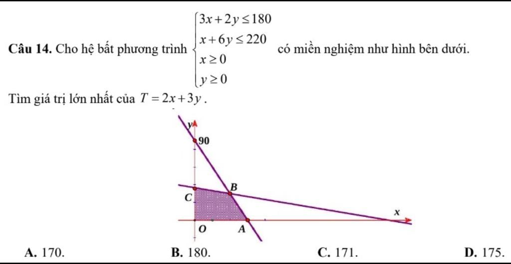 Câu 14. Cho hệ bất phương trình $\begin{cases} 3x + 2y ≤ 180\\ x + 6y ≤ 220\\x ≥ 0\\y≥0\end{cases}$ có miền nghiệm như hình bên dưới. Tìm giá trị lớn nhất của T = 2x + 3y. A. 170 B. 180 C. 171 D. 175