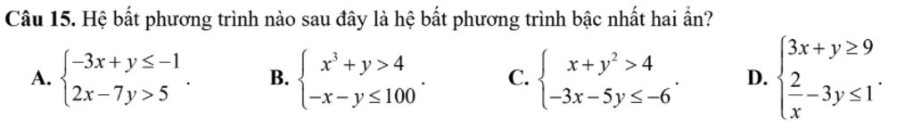 Câu 15. Hệ bất phương trình nào sau đây là hệ bất phương trình bậc nhất hai ẩn?