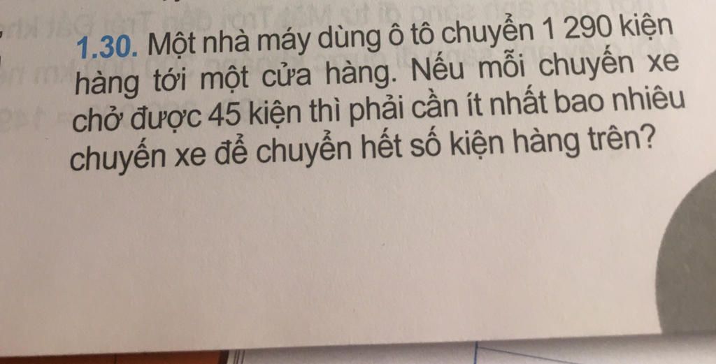 Vì nếu dùng `28` xe chuyến xe, mỗi xe chở đủ `45` kiện thì vẫn còn thừa `30` kiện `=> 28 + 1 = 29` (chuyến xe)