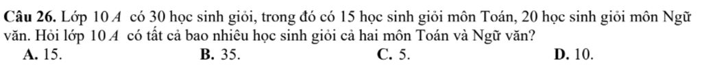 Câu 26. Lớp 10 4 có 30 học sinh giỏi, trong đó có 15 học sinh giỏi môn Toán, 20 học sinh giỏi môn Ngữ