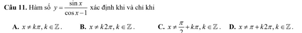Câu 11. Hàm số `(sin x)/ (cos x -1)` xác định khi và chỉ khi