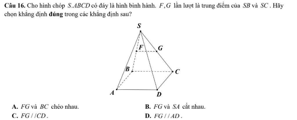 Câu 16. Cho hình chóp S.ABCD có đáy là hình bình hành. F, G lần lượt là trung điểm của SB và SC . Hãy chọn khẳng định đúng trong các khẳng định sau?