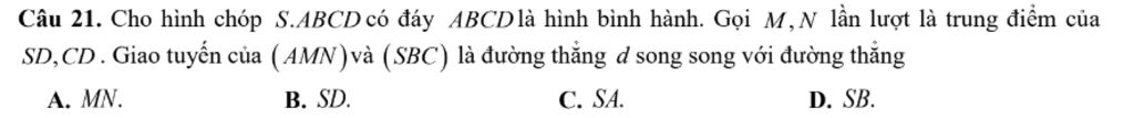 Câu 21. Cho hình chóp S.ABCD có đáy ABCD là hình bình hành. Gọi M,N lần lượt là trung điểm của SD,CD . Giao tuyến của (AMN) và (SBC) là đường thẳng d song song với đường thẳng