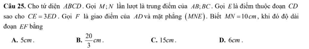 Câu 25. Cho tứ diện ABCD. Gọi M; N lần lượt là trung điểm của AB; BC. Gọi E là điểm thuộc đoạn CD sao cho CE = 3ED. Gọi F là giao điểm của AD và mặt phẳng (MNE). Biết MN =10cm, khi đó độ dài đoạn EF bằng