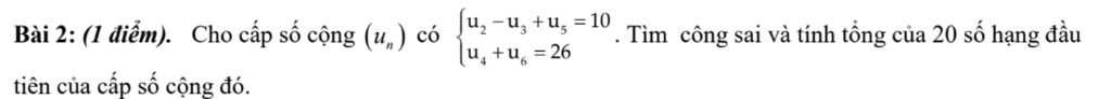Bài 2: (1 điểm). Cho cấp số cộng (`u_n`) có `u_2-u_3+u_5=10`