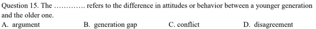 - Dựa vào cụm từ khóa "between a younger generation and the older one: giữa thế hệ trẻ và thế hệ lớn hơn" -> khoảng cách giữa hai thế hệ -> khoảng cách thế hệ