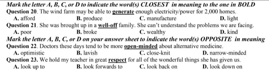 Mark the letter A, B, C, or D to indicate the word(s) CLOSEST in meaning to the one in BOLD