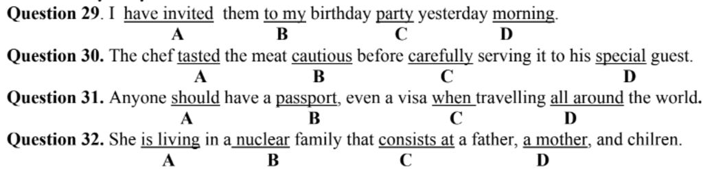 Question 30. The chef tasted the meat cautious before carefully serving it to his special guest. Question 31. Anyone should have a passport, even a visa when travelling all around the world. Question 32. She is living in a nuclear family that consists at a father, a mother, and chilren.