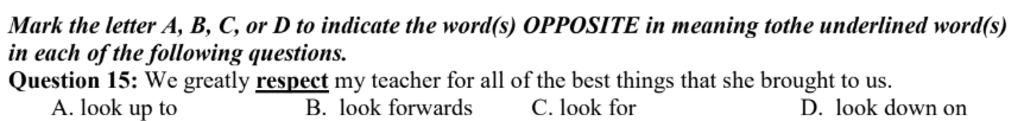 - respect (v) tôn trọng, kính trọng >< look down on (phr verb) coi thường, khinh thường