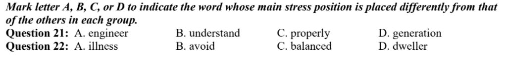 Mark letter A, B, C, or D to indicate the word whose main stress position is placed differently from that of the others in each group.