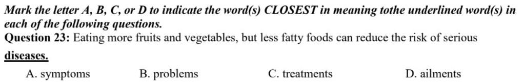 Mark the letter A, B, C, or D to indicate the word(s) CLOSEST in meaning tothe underlined word(s) in each of the following questions.