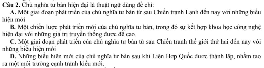 `-` Giải thích: Chủ nghĩa tư bản hiện đại thường được hiểu là giai đoạn phát triển của chủ nghĩa tư bản bắt đầu từ sau Chiến tranh thế giới thứ hai. Giai đoạn này đặc trưng bởi sự phát triển mạnh mẽ của công nghệ, toàn cầu hóa kinh tế, sự gia tăng vai trò của các công ty đa quốc gia, và sự chuyển mình trong các chính sách kinh tế. Nó cũng phản ánh những thay đổi trong cấu trúc xã hội và các mối quan hệ kinh tế, chính trị toàn cầu.
