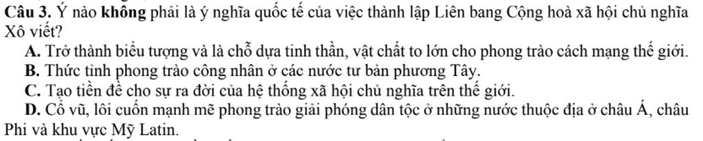 `+` Thức tỉnh phong trào công nhân ở các nước tư bản phương Tây không phải là ý nghĩa quốc tế của việc thành lập Liên bang Cộng hoà xã hội chủ nghĩa Xô viết.