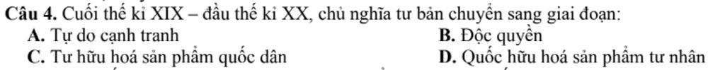 `-` Giải thích: Cuối thế kỉ XIX – đầu thế kỉ XX, chủ nghĩa tư bản chuyển sang giai đoạn độc quyền, đặc trưng bởi sự hình thành các tập đoàn, công ty độc quyền và sự gia tăng kiểm soát của các doanh nghiệp lớn đối với thị trường. Giai đoạn này đánh dấu sự chuyển mình từ nền kinh tế tự do cạnh tranh sang nền kinh tế với sự chi phối của các tổ chức độc quyền, dẫn đến sự biến đổi trong cấu trúc kinh tế và xã hội.