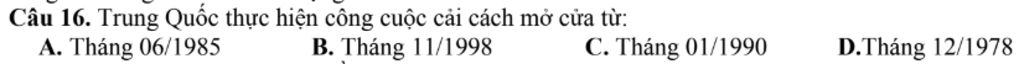 `-` Giải thích: Công cuộc cải cách và mở cửa của Trung Quốc bắt đầu vào tháng 12 năm 1978 dưới sự lãnh đạo của Đặng Tiểu Bình. Sự kiện này được coi là bước ngoặt quan trọng trong việc chuyển đổi nền kinh tế Trung Quốc từ nền kinh tế kế hoạch sang nền kinh tế thị trường, nhằm thúc đẩy phát triển kinh tế và hội nhập quốc tế. Cải cách mở cửa đã dẫn đến nhiều thay đổi sâu rộng trong mọi lĩnh vực, từ kinh tế, xã hội đến văn hóa.