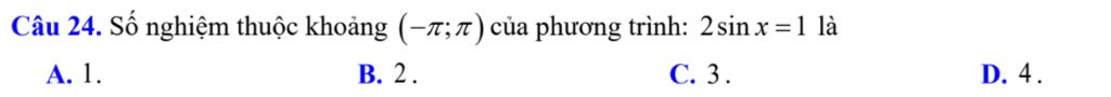 Câu 24. Số nghiệm thuộc khoảng (-π;π) của phương trình: 2sinx=1 là
