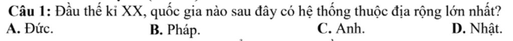 `1)`Đầu thế kỉ `XX`, quốc gia nào sau đây có hệ thống thuộc địa rộng lớn nhất?