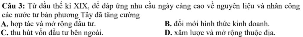 `-` Giải thích: Từ đầu thế kỷ XIX, các nước tư bản phương Tây tăng cường xâm lược và mở rộng thuộc địa để đáp ứng nhu cầu về nguyên liệu, nhân công, cũng như thị trường tiêu thụ sản phẩm. Đây là một phần của quá trình bành trướng chủ nghĩa đế quốc.