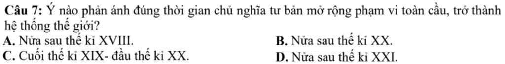`7)` Ý nào phản ánh đúng thời gian chủ nghĩa tư bản mở rộng phạm vi toàn cầu, trở thành hệ thống thế giới?