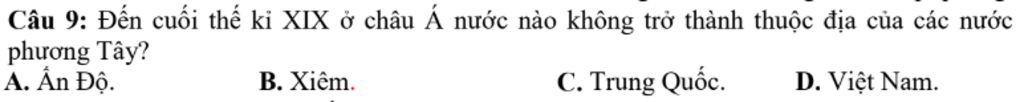 `-` Giải thích: Đến cuối thế kỷ XIX, Xiêm (Thái Lan) không trở thành thuộc địa của các nước phương Tây, mà duy trì được độc lập thông qua các cuộc cải cách và ký kết các hiệp ước với các nước phương Tây. Trong khi đó, Ấn Độ, Trung Quốc và Việt Nam đều trở thành thuộc địa hoặc bị chiếm đóng bởi các cường quốc phương Tây.