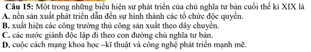 `-` Giải thích: Cuối thế kỷ XIX, sự phát triển mạnh mẽ của nền sản xuất đã dẫn đến sự hình thành các tổ chức độc quyền, nơi mà một số công ty lớn kiểm soát phần lớn thị trường và sản xuất, điều này thể hiện rõ nét trong giai đoạn chủ nghĩa tư bản độc quyền.
