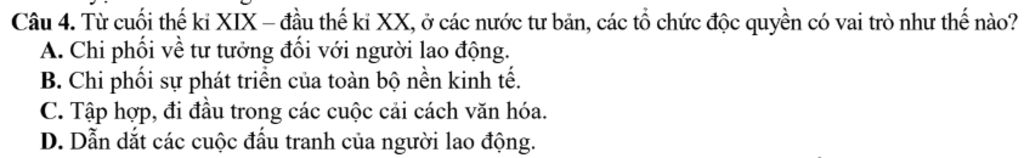 GT:Từ cuối thế kỉ XIX – đầu thế kỉ XX, ở các nước tư bản, các tổ chức độc quyền có vai trò chi phối sự phát triển của toàn bộ nền kinh tế . chi phối sự phát triển của toàn bộ nền kinh tế. Chúng kiểm soát thị trường, ảnh hưởng đến giá cả và sản xuất hàng hóa.