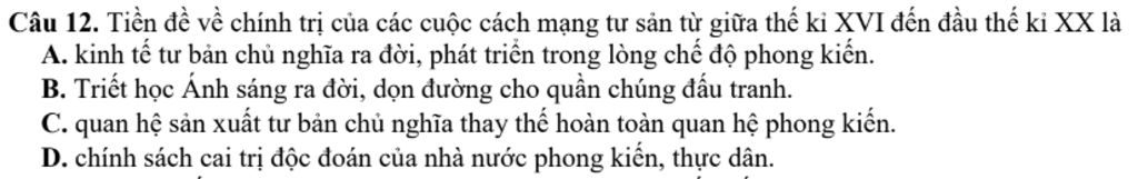 Câu 12. Tiền đề về chính trị của các cuộc cách mạng tư sản từ giữa thế kỉ XVI đến đầu thế kỉ XX là A. kinh tế tư bản chủ nghĩa ra đời, phát triển trong lòng chế độ phong kiến. B. Triết học Ánh sáng ra đời, dọn đường cho quần chúng đấu tranh. C. quan hệ sản xuất tư bản chủ nghĩa thay thế hoàn toàn quan hệ phong D. chính sách cai trị độc đoán của nhà nước phong kiến, thực dân.