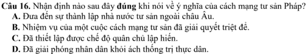 `-` Giải thích: Cách mạng tư sản Pháp (1789) không chỉ có ý nghĩa lớn đối với nước Pháp mà còn là một biểu tượng cho các phong trào cách mạng ở châu Âu và các thuộc địa khác, dẫn đến việc thành lập các nhà nước tư sản ở nhiều nơi.
