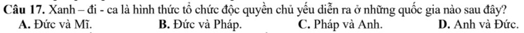 Câu 17. Xanh – đi - ca là hình thức tổ chức độc quyền chủ yếu diễn ra ở những quốc gia nào sau đây?